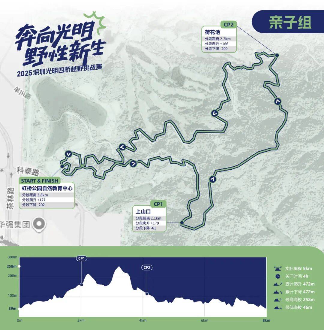 本次比赛路段以光明虹桥郊野径为主线,串联大顶岭郊野径、光明田园步道、凤凰径路段。