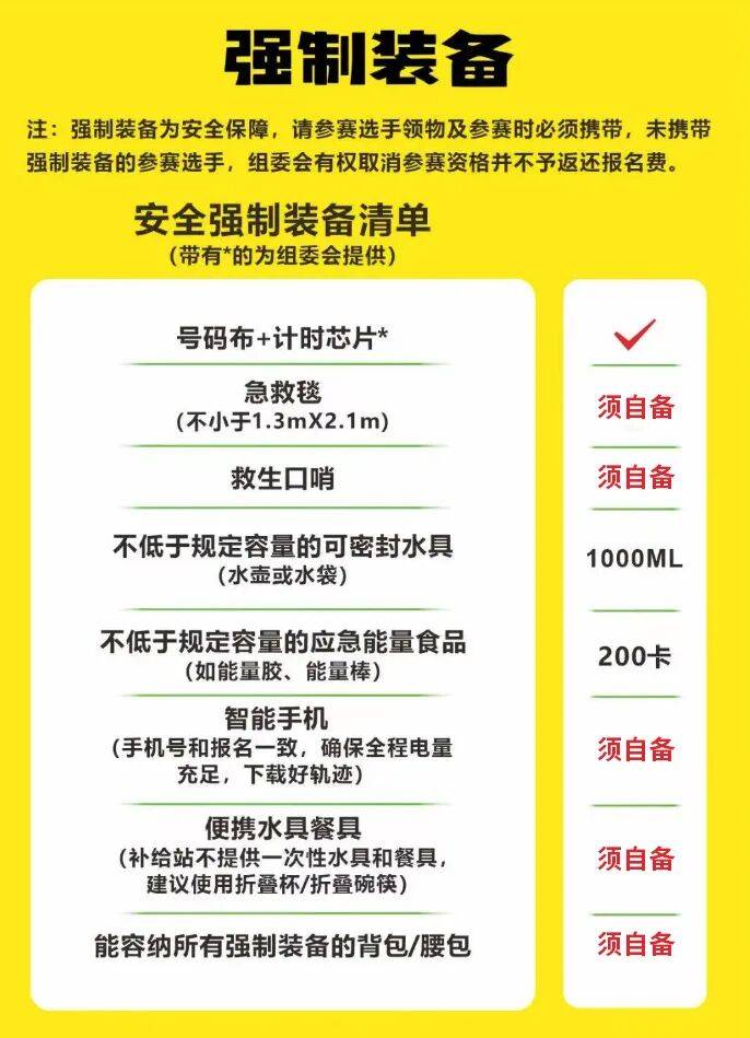 由于户外越野赛的特殊性,所以赛事设置强制装备。即在比赛前,必须携带赛事要求的所有装备方可参赛。否则组委会有权取消您的参赛资格且不予退还报名费。强制装备作为户外运动的最低安全保障,请选手们报名前务必根据要求认真准备