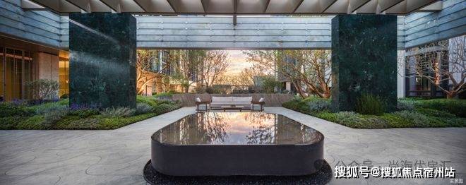 庭院中遍布着睡莲,从这里往出去像一幅画,高低层次的叠水景观,超大型的原石,还有私密的谈话空间,舒适惬意。